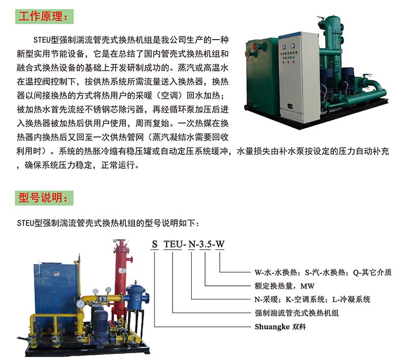 強制湍流管殼式換熱機組是集管殼式換熱器、循環水泵、疏水器系統、補水泵、除污器、溫度計、各種儀表傳感器、管路和閥門及工控為一體的成套換熱控制設備。利用歐文(OWEN)湍流抖振原理,換熱管采用特殊工藝制成的雙螺紋螺旋槽的結構,使熱媒在傳熱過程中充分釋放能量,換熱系數大大提高。該設備廣泛應用于工業生產、公共建筑、住宅建筑等的采暖、空調、制冷、生活熱水及熱電系統的換熱及冷凝。